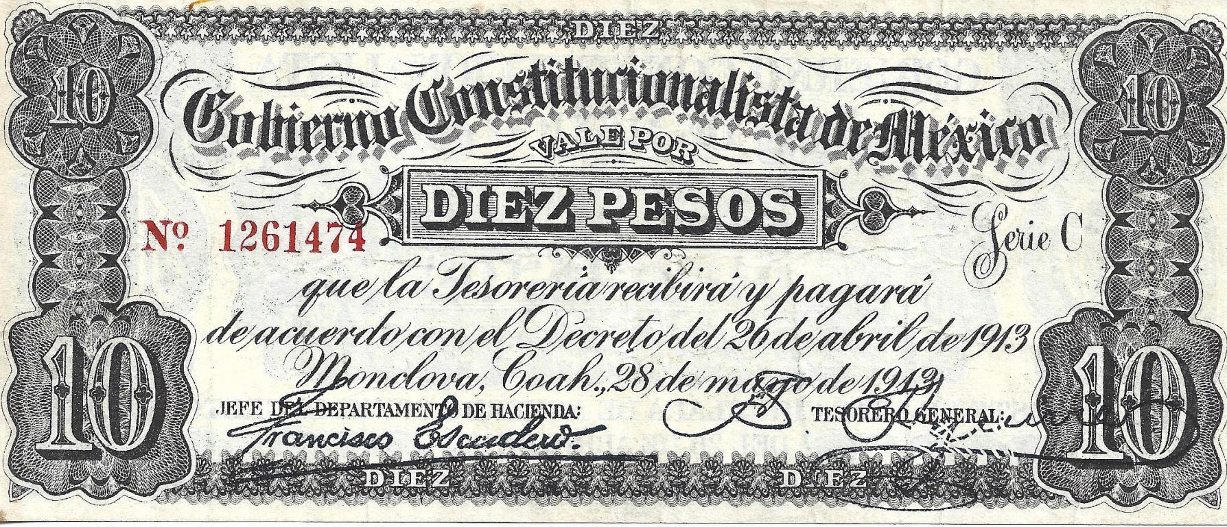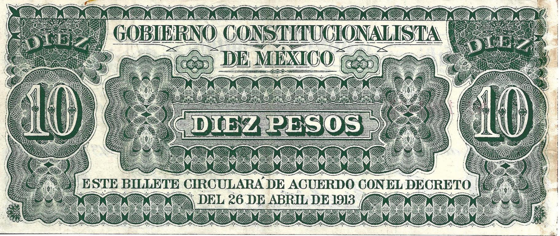 10 PESOS GOBIERNO CONSTITUCIONALISTA DE MEXICO (1913)