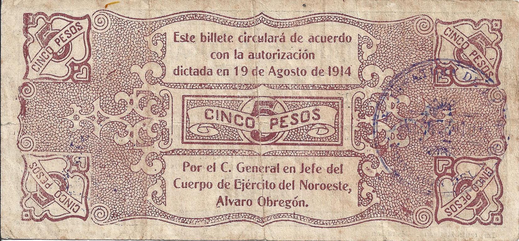 5 PESOS PAGADURIA GENERAL DE LA BRIGADA DE SINALOA (1914)